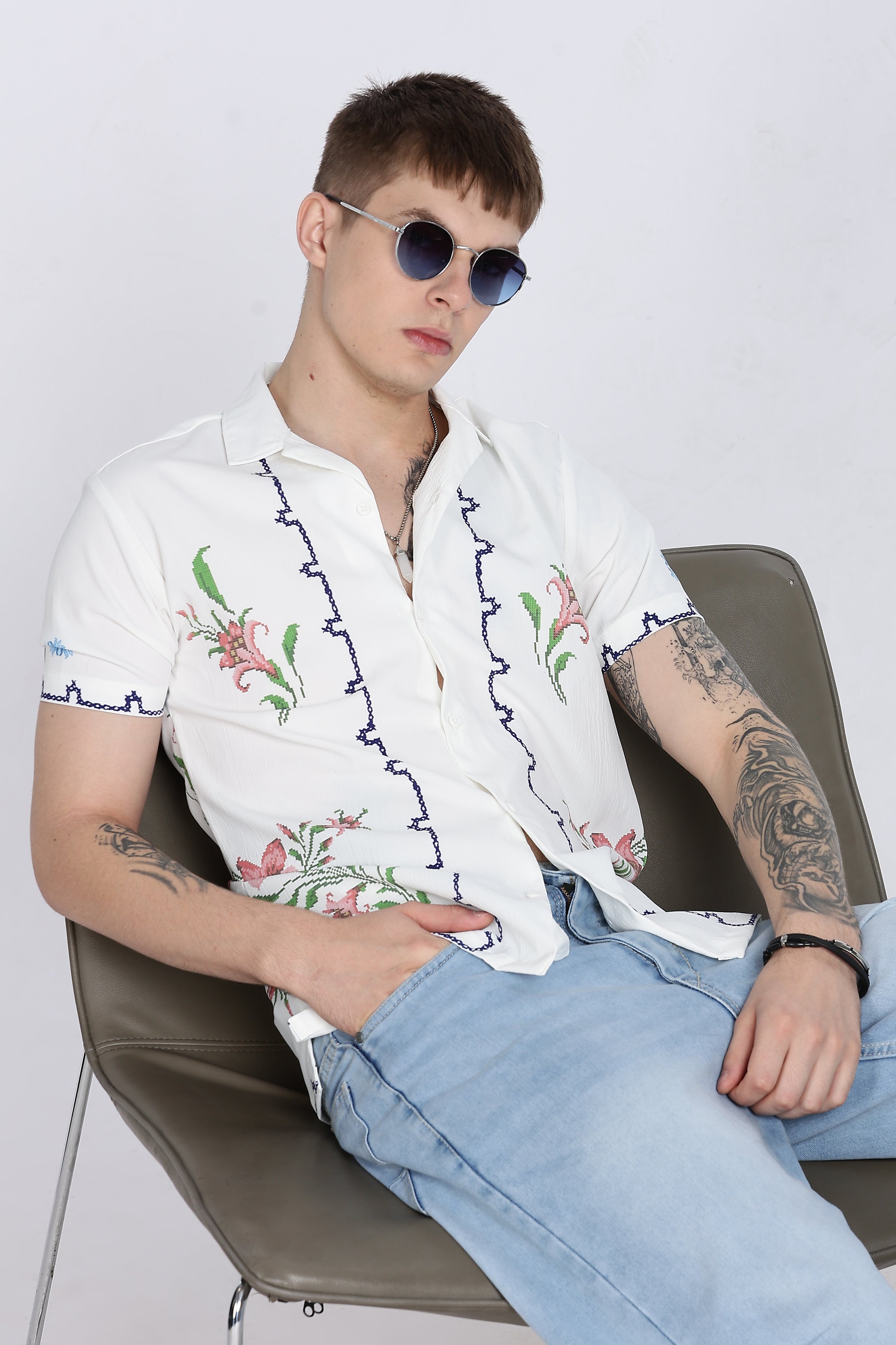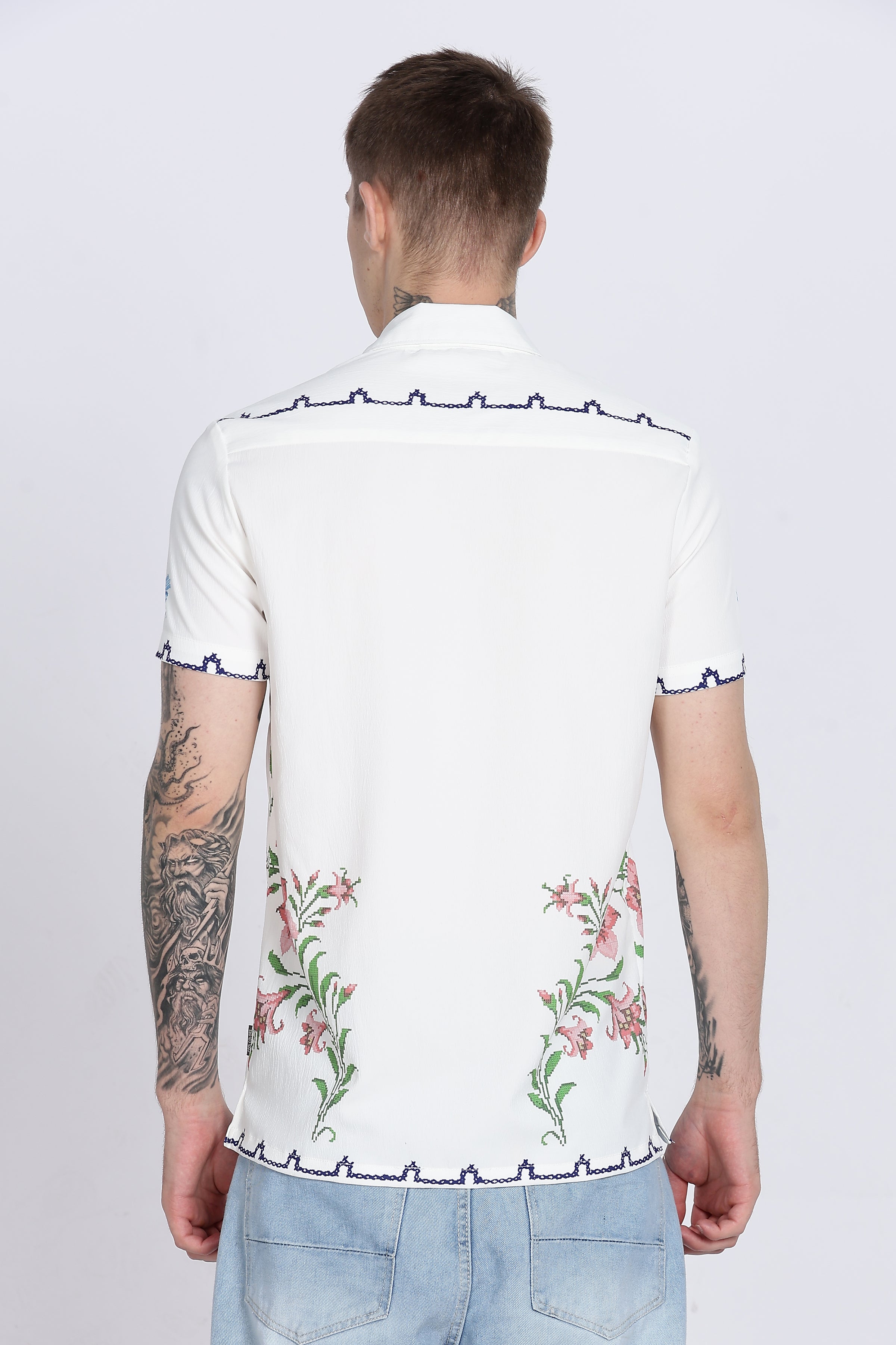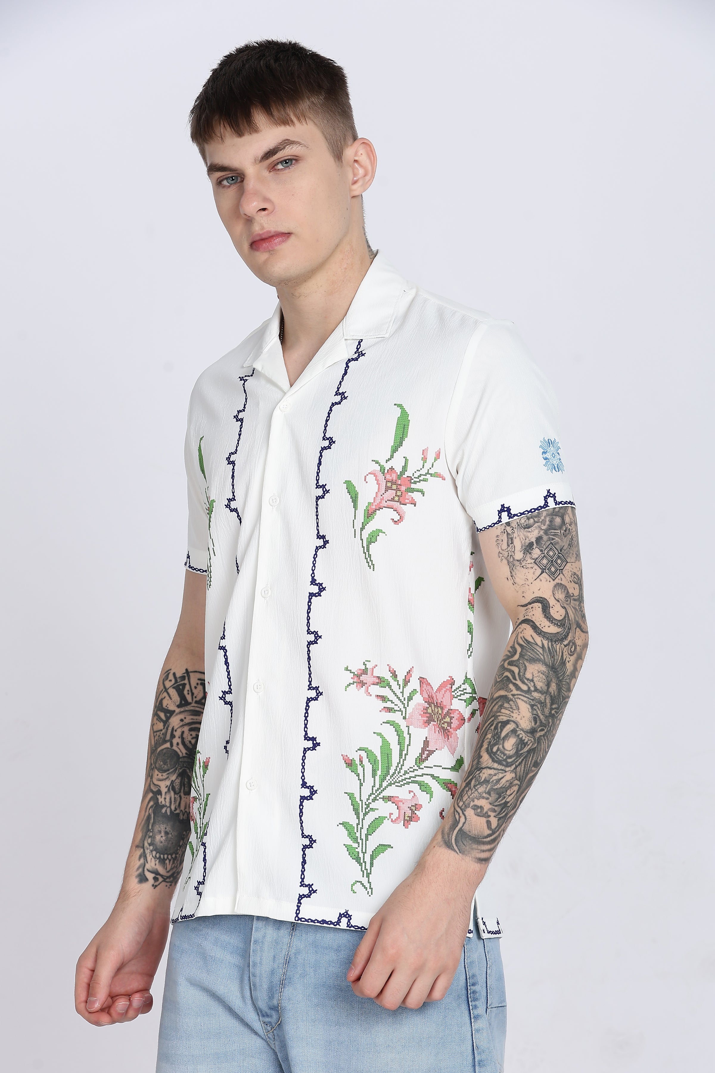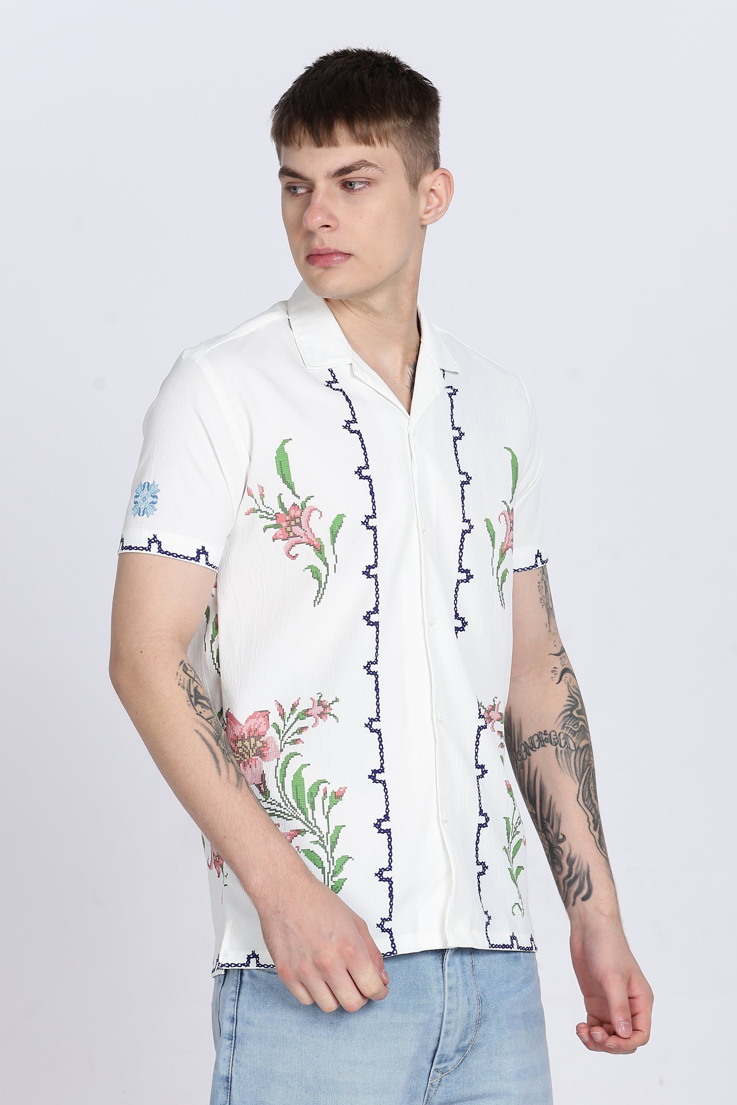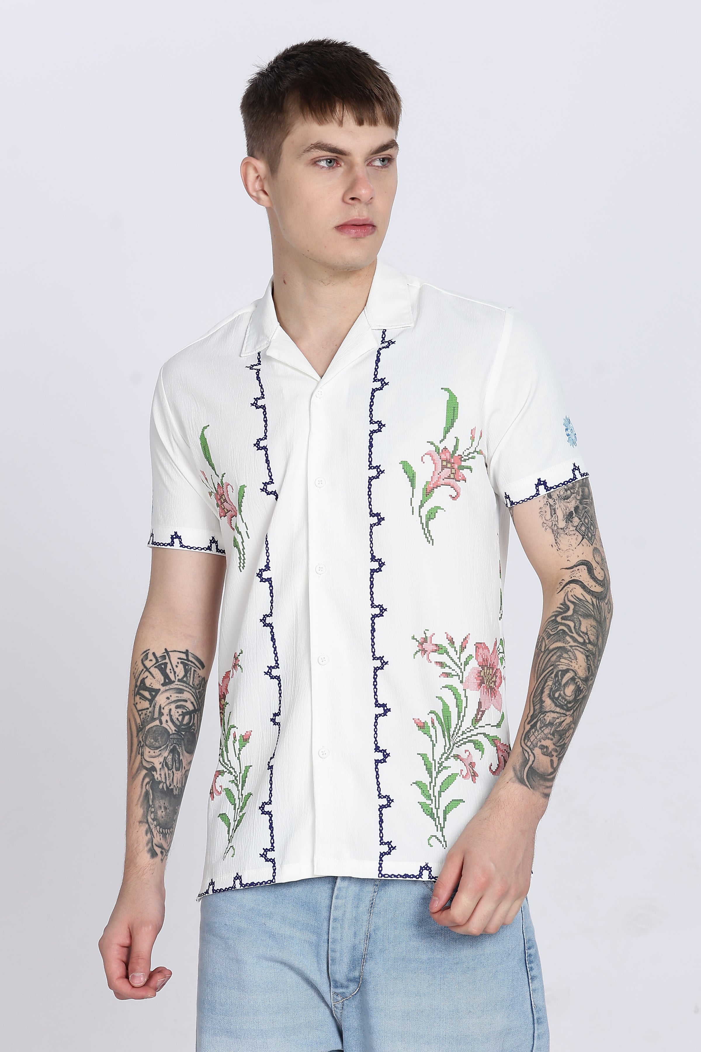 White Floral Print Slim Fit Half Sleeve Cuban Collar Shirt