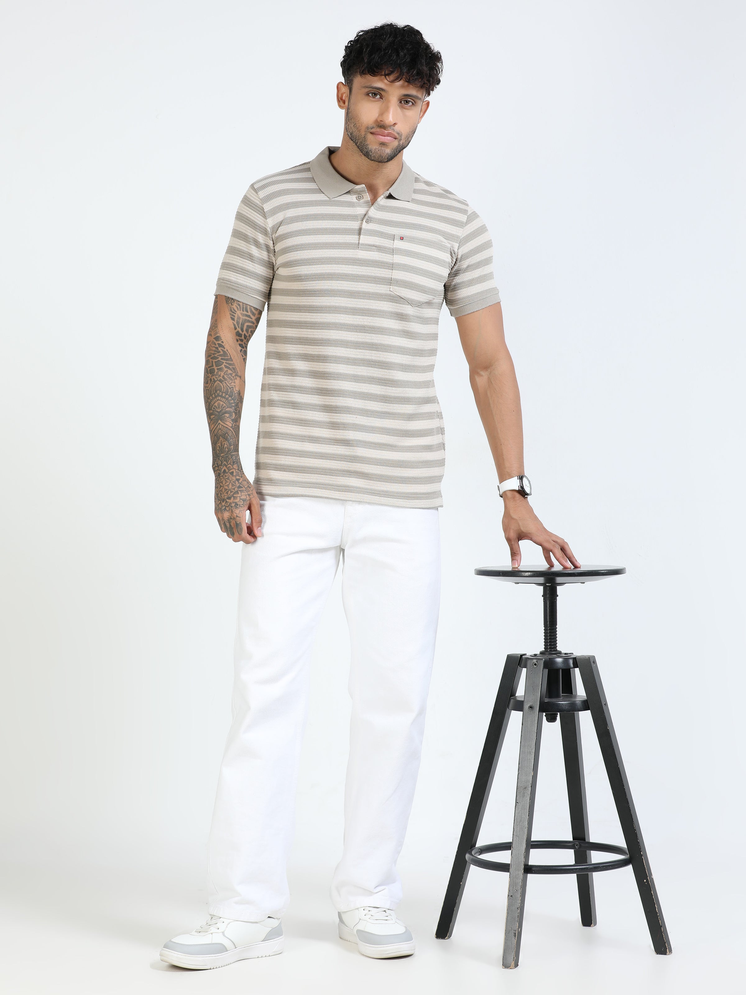 Made from premium cotton-blend fabric, this polo features a textured jacquard striped design, offering a stylish twist on the classic polo. The polo collar with button placket enhances its smart-casual appeal, making it perfect for both office Fridays and weekend outings.