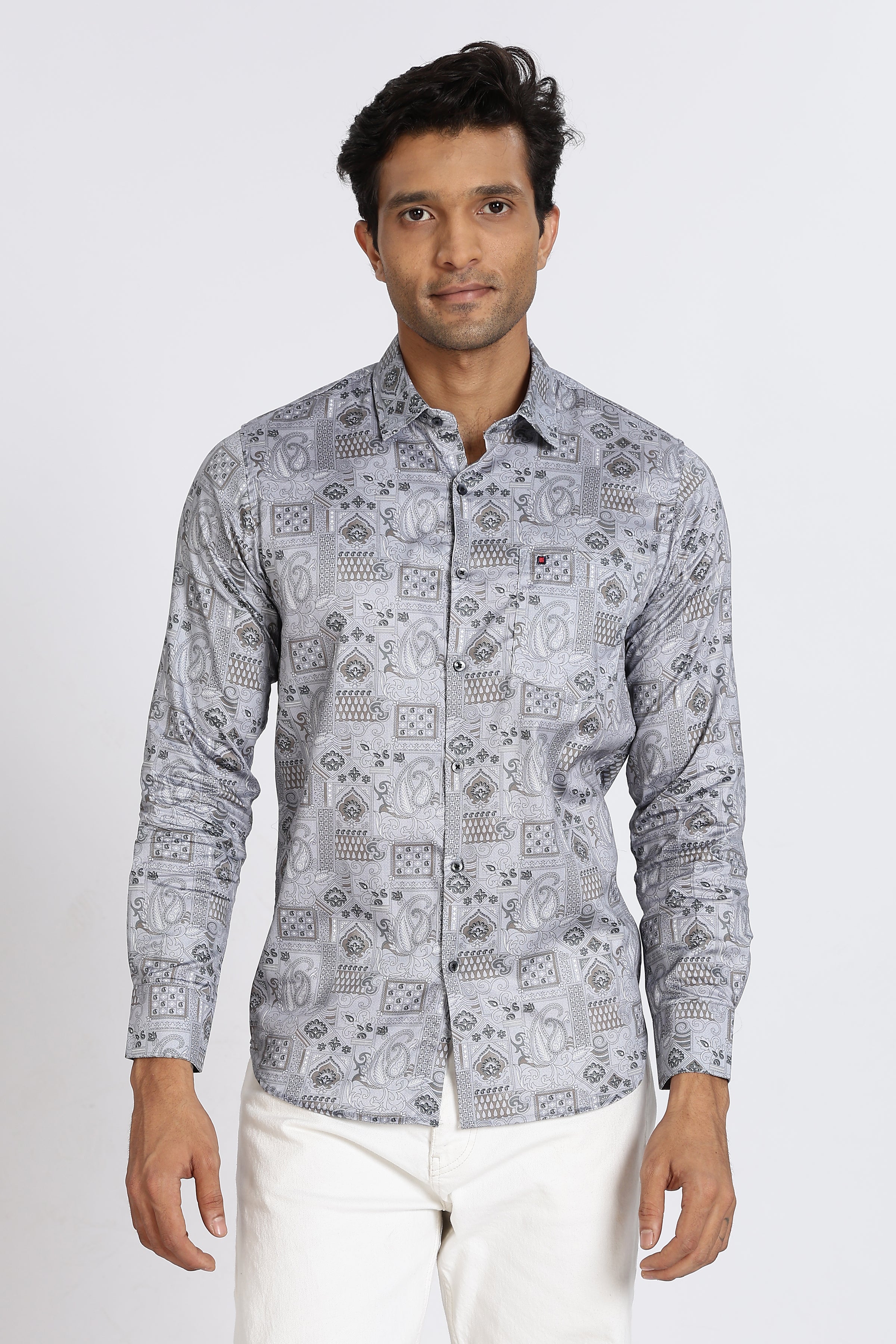 Men Grey Floral Print Full Sleeve Slim Fit Casual Shirts